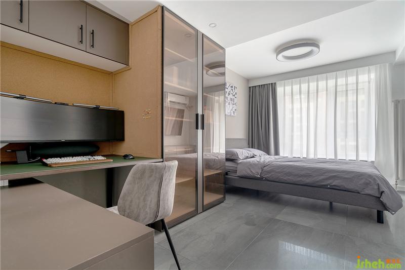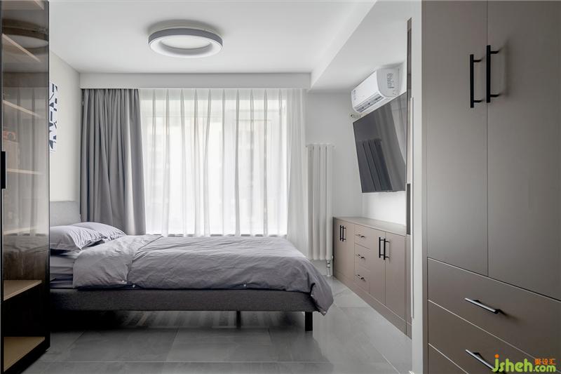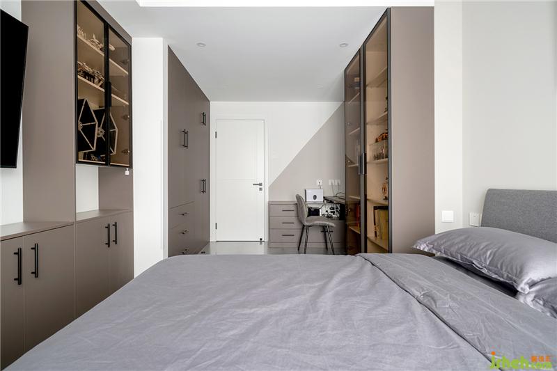 右邊是衣柜,所以深度比較大一些。因為一家人都有在臥室看電視的習慣,所以倆個臥室都配有壁掛的電視。顏色上以不同層次的幾個灰度營造氛圍,實際出來的效果達到了很舒適的高級感。