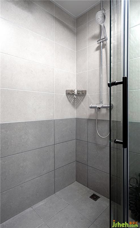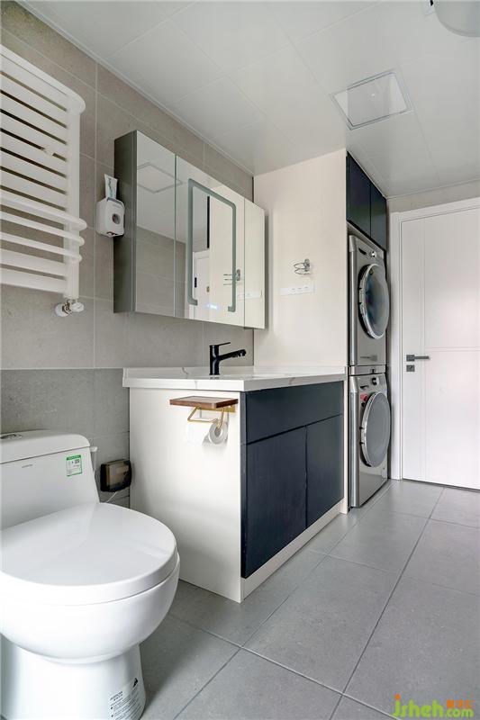 洗衣機(jī)和烘干機(jī)的上下水,電位要提前預(yù)留好,這樣才能做到美觀。地面是啞光灰的砂巖磚,一直蔓延到墻面半高,在視覺上也會(huì)把衛(wèi)生間延伸變大。