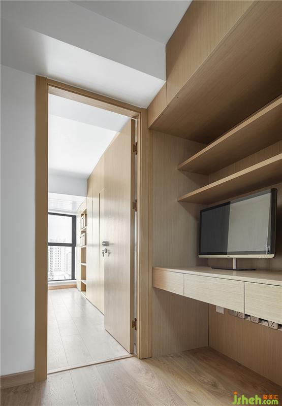打開兒童房的門,兒童房的光線可照到走廊的辦公區(qū)域,兒童房門套與書桌之間不是嚴(yán)詞合縫,門套增加一條余量正好可以彌補(bǔ)這段距離,使整體變得美觀。