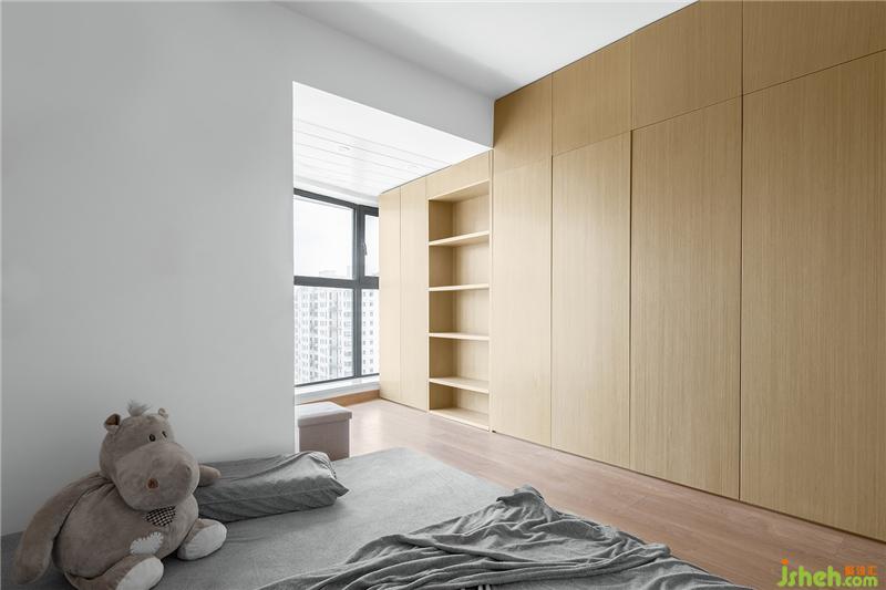 兒童房的一側(cè)做了整面墻的收納柜,孩子隨著年齡的增長(zhǎng)玩具、書籍、衣物會(huì)越來越多,無處擺放就會(huì)使空間變得雜亂,大量的儲(chǔ)物柜會(huì)解決這些令人頭疼的問題。