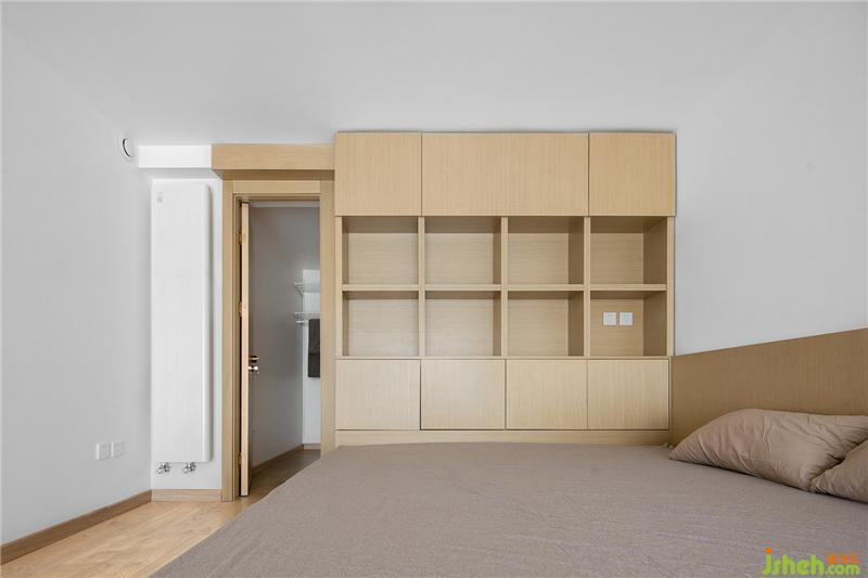 主臥中包含一間凈深2550mm儲(chǔ)物間,儲(chǔ)物形式?jīng)]有選用尋常的柜體,而是選擇簡(jiǎn)單的白色鐵藝框架,雜物擺放形式多樣化,足以收納夫婦二人平時(shí)的生活物品。主臥儲(chǔ)物柜上方將空調(diào)藏入柜體中,使用時(shí)將液壓桿撐起,不使用時(shí)看似一個(gè)整體,最化程度弱化空調(diào)的存在。