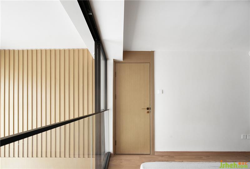 將門套做到頂,使空間更具有層次感,靠近推拉門臥室內(nèi)側(cè)安裝了鋼架玻璃扶手,確保日常使用安全。