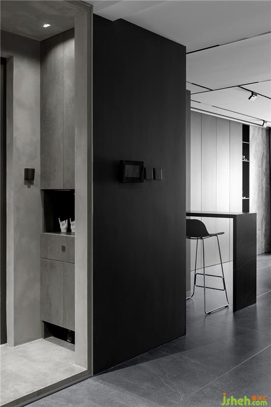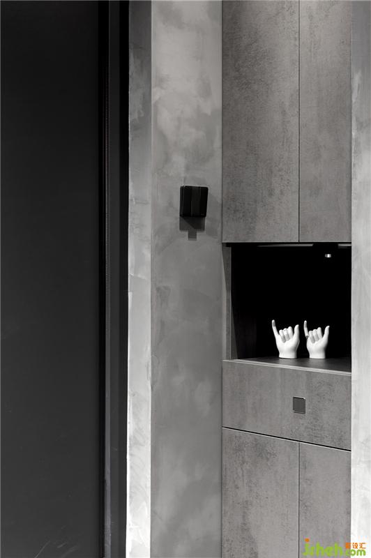 入戶門一側(cè)利用新建墻體增添一處玄關(guān)收納柜,柜門選擇與墻面一致的水泥灰色,與銀灰色的隱藏拉手搭配相得益彰。