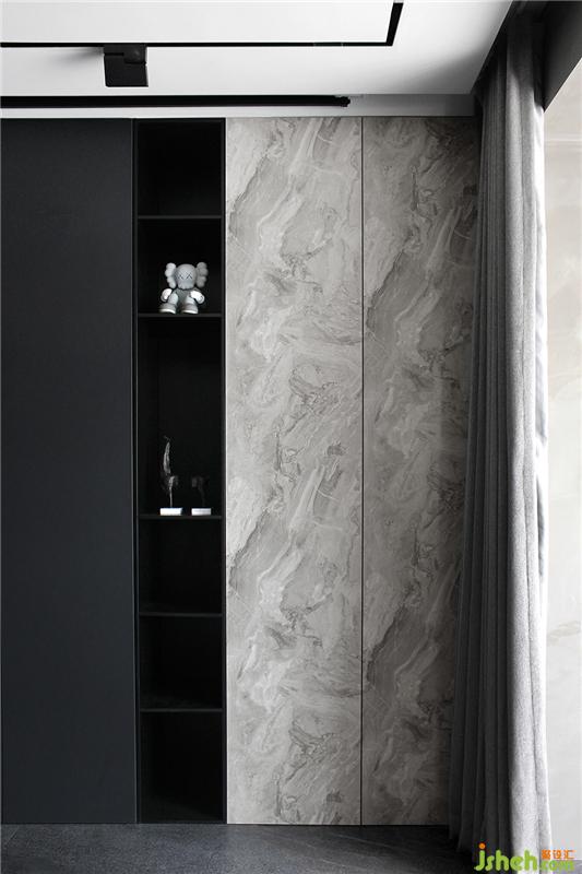 收納柜中間很窄的一部分做了開放格形式,可以展示喜愛的一些收藏,邊側(cè)柜門面板采用白色仿石材的紋路,不同顏色的加入使空間的基調(diào)也變得輕松起來(lái)。