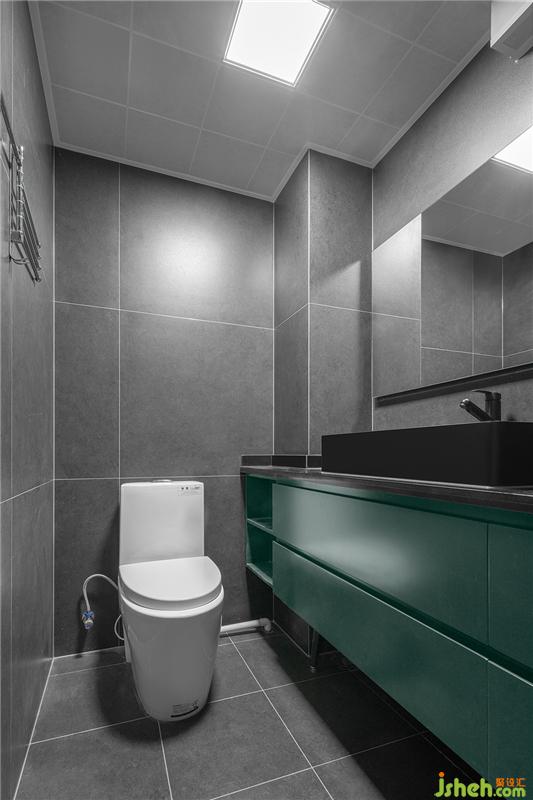 客衛(wèi)臨近馬桶位置安裝了與眾不同的方形淋浴房,規(guī)格為800*800mm。門的開啟形式選擇雙側(cè)推拉,既方便又節(jié)省空間。淋浴房方正中的線條美感搭配灰色墻地磚帶來現(xiàn)代風格的舒適感。