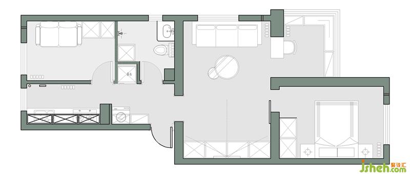 把次臥與衛(wèi)生間之間的隔墻,向次臥方向改動。擴大了衛(wèi)生間的面積,增加了衛(wèi)生間的淋浴區(qū)。在這個基礎上,把廚房中的冰箱解放出來,內(nèi)嵌到墻體里。去掉陽臺的門連窗增加客廳的使用面積。