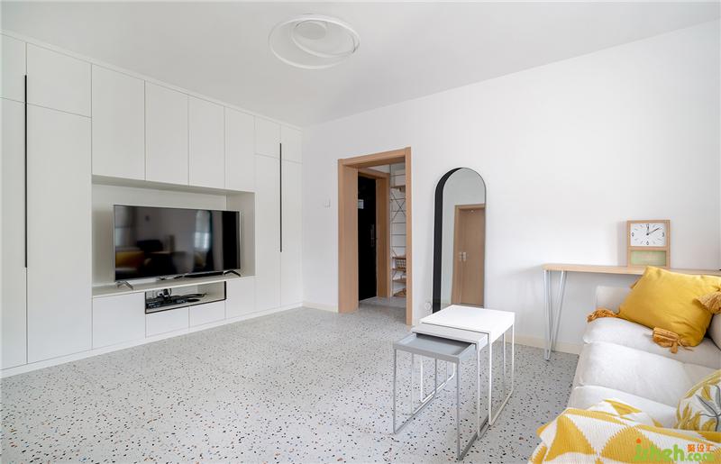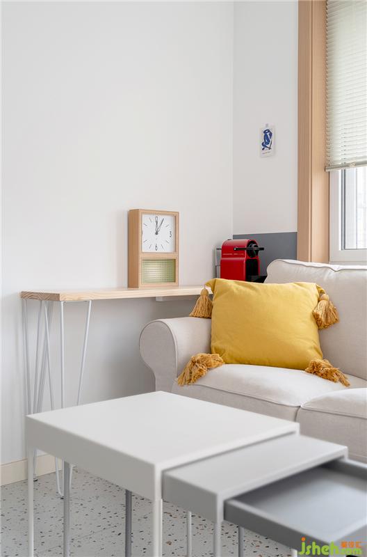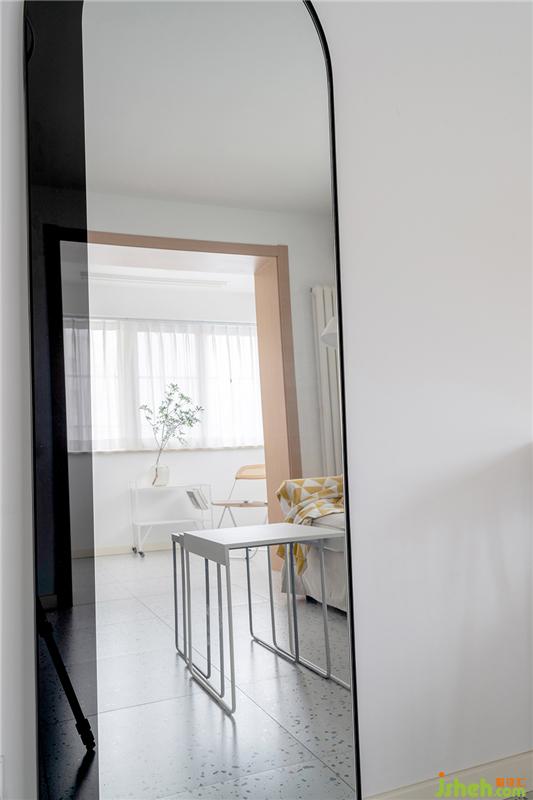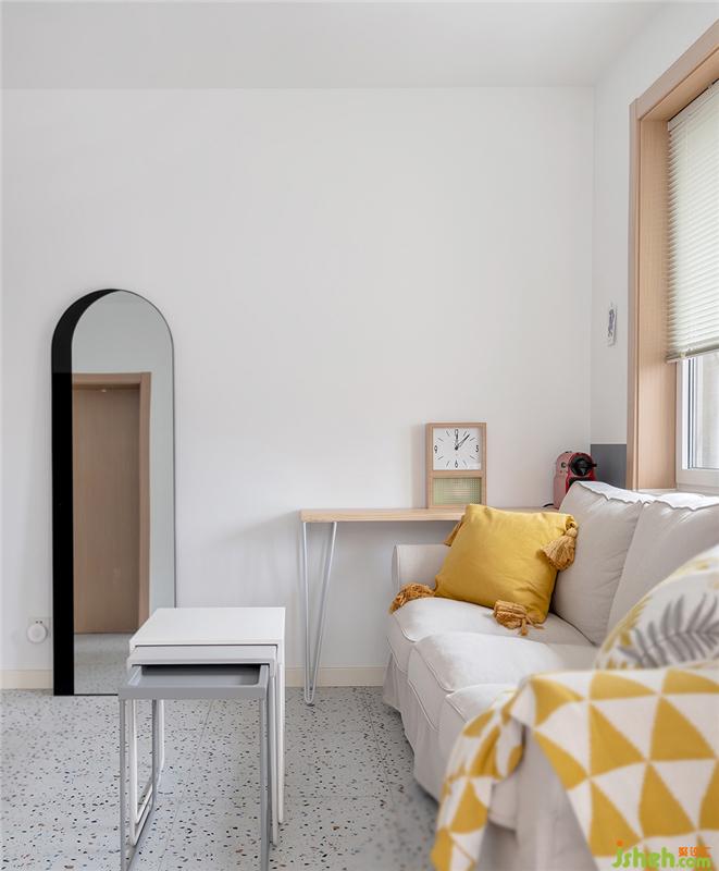沙發(fā)茶幾都是宜家款,茶幾可以伸縮想平時只有業(yè)主的時候可以做為臨時餐桌使用,拱門造型的鏡子使空間更有趣味感。