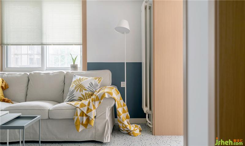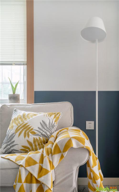 沙發(fā)一角黃色的掛毯與抱枕顏色相呼應,背后的上下墻與落地燈來凸顯沙發(fā)的質感。
