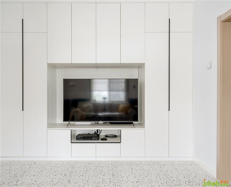 柜體基材是愛格板,柜體正面圖600mm深的柜體滿滿的儲物空間,右側的柜體擺放了業(yè)主換季的衣物以及聚會用的折疊餐桌。在電視上方儲藏了業(yè)主喜歡的餐具以及衛(wèi)生紙等物品,左側以儲藏業(yè)主的鞋子。
