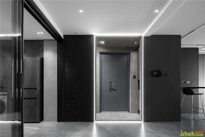 將玄關(guān)區(qū)域地面抬高10公分,室內(nèi)形成下沉空間??梢愿玫拇_定功能分區(qū),而且增加了空間的趣味性,更使其富有層次感。將四周的墻面嵌入線性燈帶形成“口”字形造型,利用燈光將玄關(guān)區(qū)域獨(dú)立出來(lái),營(yíng)造出不一樣的氛圍,進(jìn)屋后的第一儀式感。