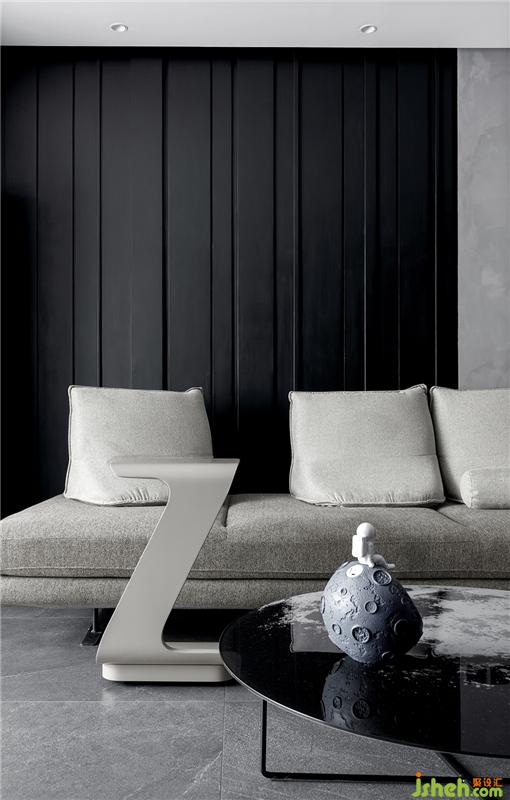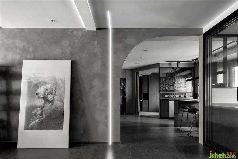 客廳埡口一側(cè)墻面利用L型的線性燈帶劃分客廳與其他功能區(qū),光線柔和舒適并起到分割的作用。一旁引人注目的狗狗畫像別具意義,設(shè)計師和業(yè)主均為愛狗人士,由設(shè)計師親手繪制業(yè)主家的狗狗畫像并贈與,這同樣也基于業(yè)主對設(shè)計師才華的肯定與相互之間的欣賞。