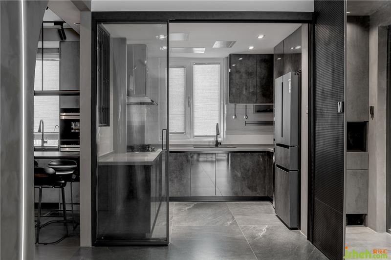 將原戶型中廚朝向客廳的墻體拆除,向外延伸空間面積并用玻璃推拉門做隔斷,不僅擴大了中廚操作臺面積而且使內(nèi)部采光更通透。