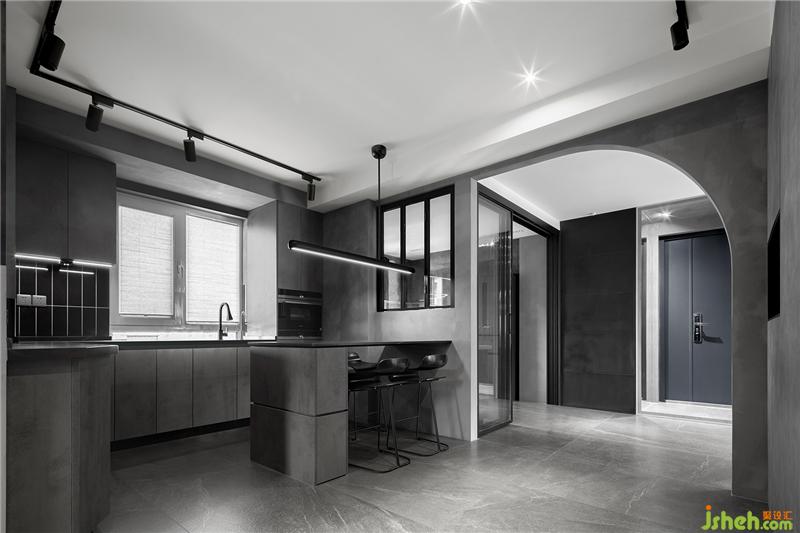 西廚區(qū)櫥柜經(jīng)過規(guī)劃布置與餐桌形成迂回動線,大大提高過道的利用率。西廚與中廚之間的墻面開了一扇小窗,增加烹飪與用餐時的交互性。