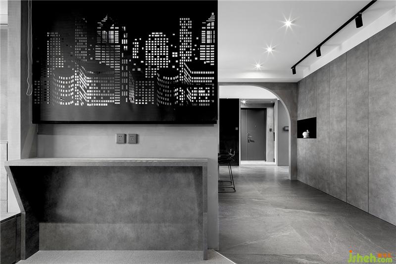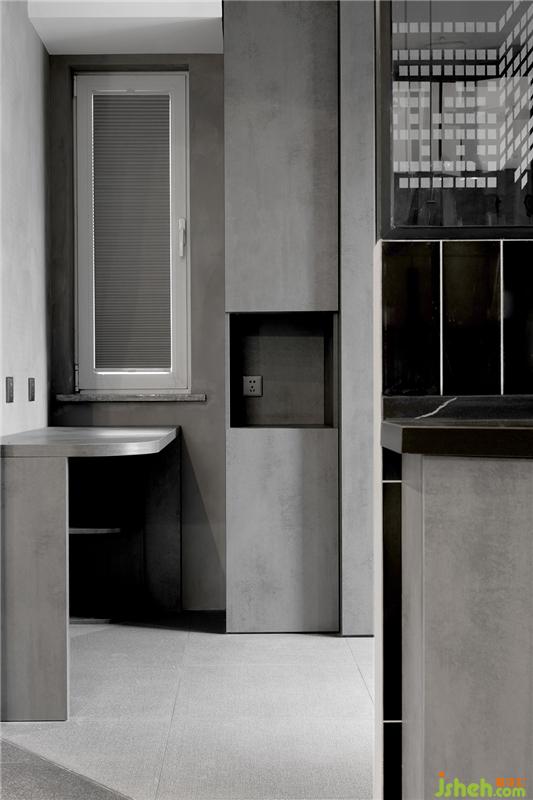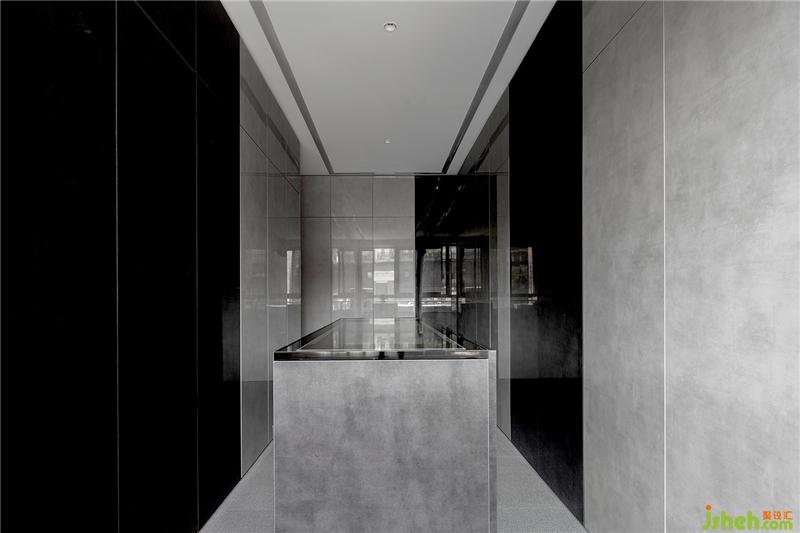 又是三種灰色系材質(zhì)搭配的空間。衣帽間柜門的鏡面效果反射產(chǎn)生的光線對空間進行提亮,搭配中間水泥色首飾柜時刻透露出優(yōu)雅的氣息。