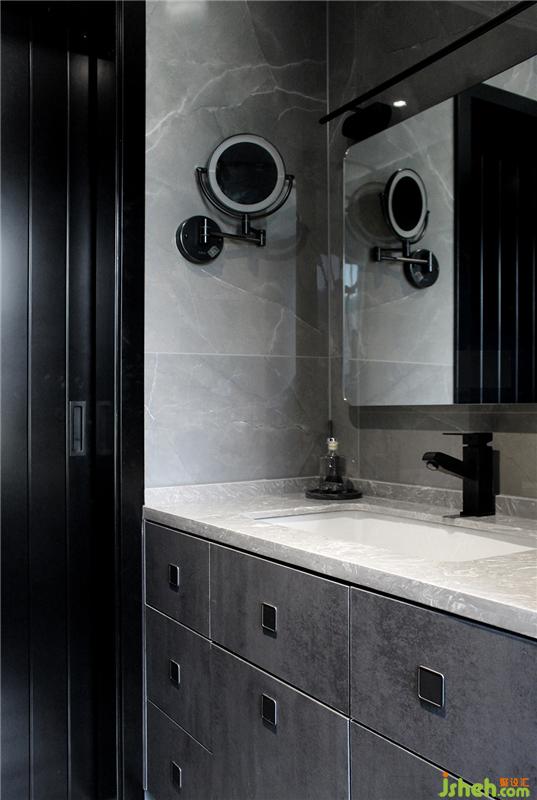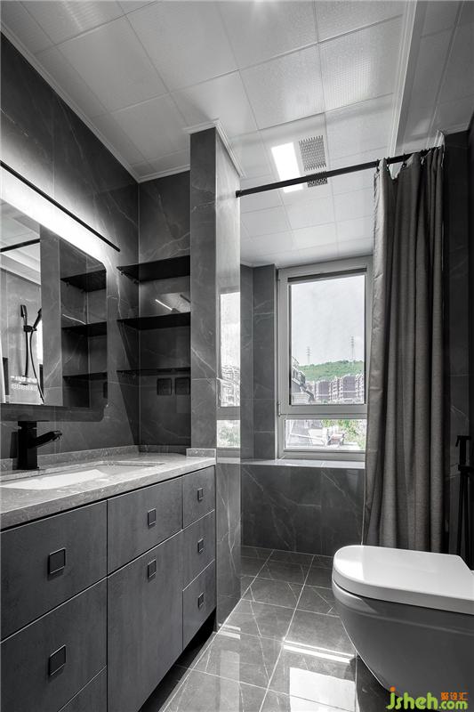 衛(wèi)生間墻地磚一體,均為灰色系,浴簾的使用能夠很好的劃分干濕區(qū)。利用墻體在洗手臺一側(cè)制作開放格,黑色玻璃作為隔板,節(jié)省了洗手臺不少的空間。