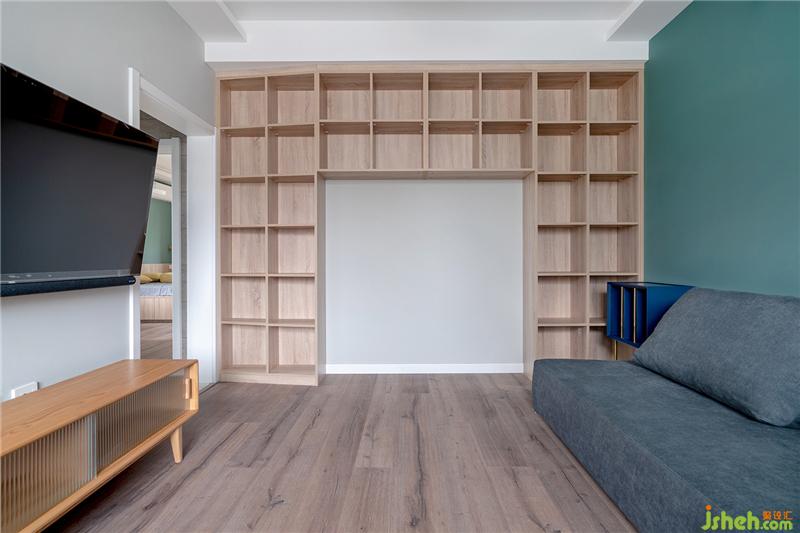 客廳區(qū)域利用埡口與墻之間的距離做了整面墻的定制柜開(kāi)放格,可容納孩子大量的書(shū)籍,也可展示一些收藏,具有很強(qiáng)實(shí)用性。地面鋪貼了略帶結(jié)疤的實(shí)木地板,地板呈現(xiàn)出原始的紋理與顏色,體現(xiàn)出自然之美。