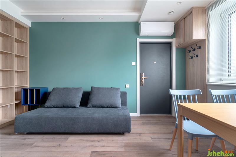 沙發(fā)背景墻涂刷了莫蘭迪色系墻漆,搭配深灰色沙發(fā)床給空間帶來(lái)寧?kù)o祥和的氛圍。擺放在角落的深藍(lán)色邊幾小巧而獨(dú)立,具有收納能力的同時(shí)充斥一絲高級(jí)感。