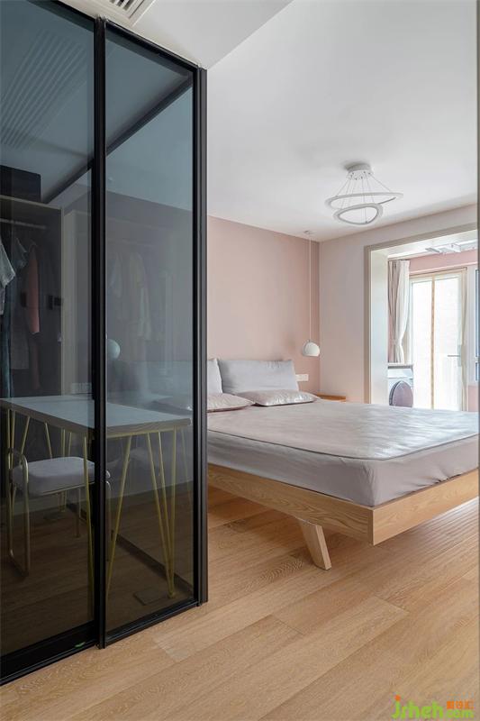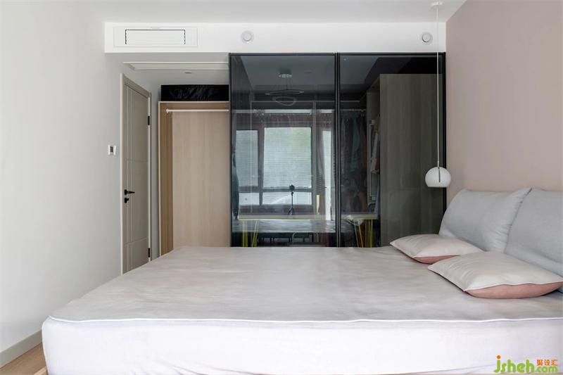 黑色的是衣帽間隔斷玻璃,采用玻璃形式的好處,首先是它自身的厚度比較薄,讓衣柜的延展距離更多,畢竟小空間的利用,都是毫厘必爭。其次玻璃是透光的,這樣也解決了衣帽間暗間,沒有采光的問題。