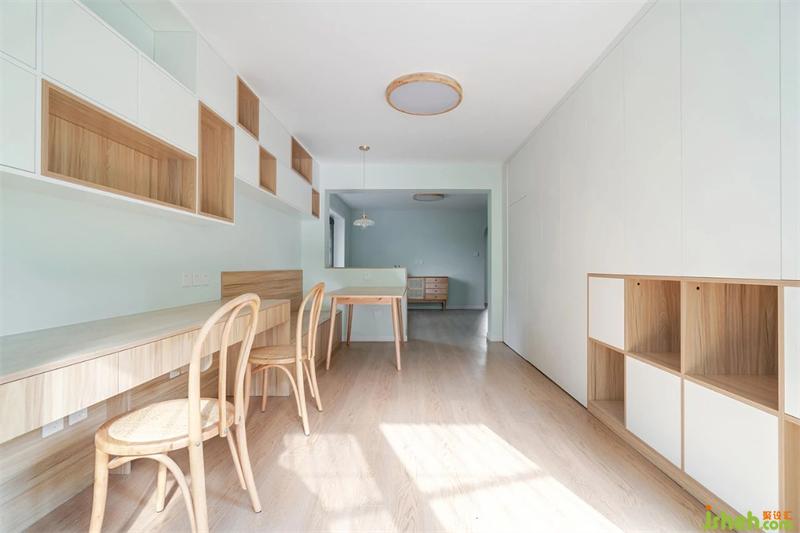 書房右側(cè)是整面墻的儲物柜,進(jìn)深600mm,衣服可以全部收納進(jìn)來,輕松換季。敞開格是兩個(gè)孩子的玩具收納區(qū)域,有了固定的區(qū)域,更方便分類。