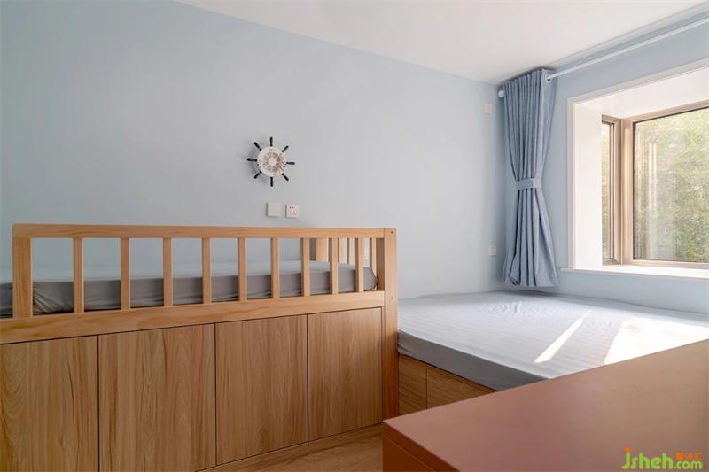 朝南的兒童房,定制了超大的榻榻米睡眠區(qū),旁邊加了獨(dú)立的單人床,輕松的容納下一家四口的睡眠空間。