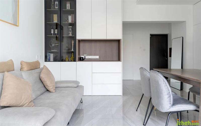天津家居設(shè)計(jì)為保證空間整體層高,沒(méi)有做太多的吊頂。沙發(fā)的旁邊安排了一組收納,來(lái)滿足展示和備餐需求。暖灰色的亮光磚有放大空間的效果,營(yíng)造簡(jiǎn)潔隨意的氛圍。