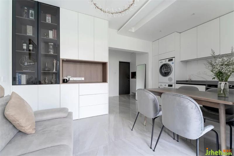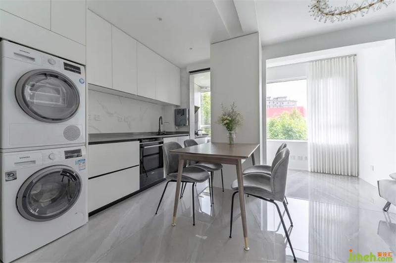 廚房入口的家政柜,內(nèi)嵌了洗衣機(jī)以及烘干機(jī)。旁邊是一整排操作臺(tái)和收納空間,讓使用功能上得到很好的銜接。