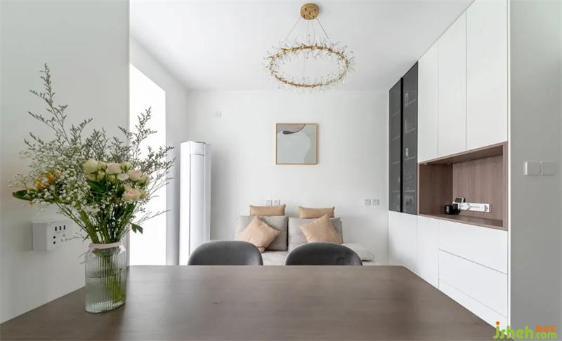 餐邊柜中的開(kāi)放格,裝得下家里所有小家電,還能滿足雜物收納?;疑萍疾忌嘲l(fā)既可以防止貓抓,又不會(huì)像皮革一樣夏天容易黏皮膚。