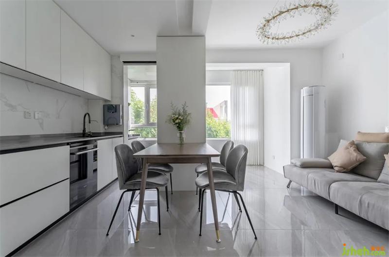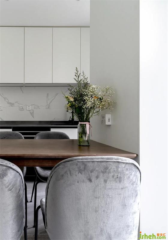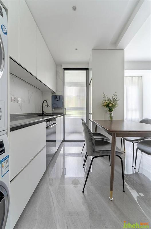 把煙機(jī)灶具外移到陽(yáng)臺(tái),還增加一墩廚房面積,極窄長(zhǎng)虹玻璃移門(mén)隔絕油煙。爵士白墻磚與灰色啞光臺(tái)面,搭配白色愛(ài)格板櫥柜,潔白明亮的空間體現(xiàn)現(xiàn)代質(zhì)感。