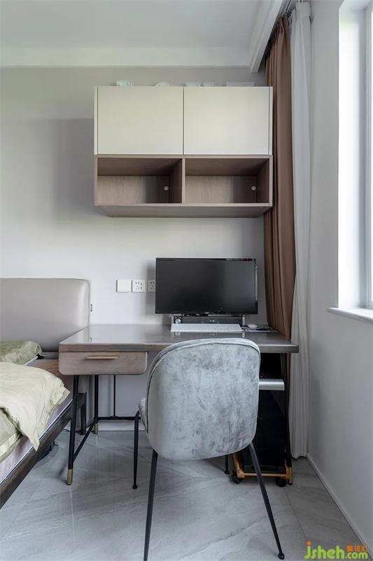臥室在靠近窗戶一側(cè)安排了工作臺(tái),在其上方安排了儲(chǔ)物空間。開(kāi)放格可以做為書(shū)架使用,方便屋主夜讀。窗簾與床頭的顏色相接近,讓整個(gè)空間相呼應(yīng)。