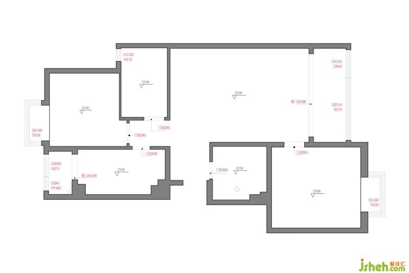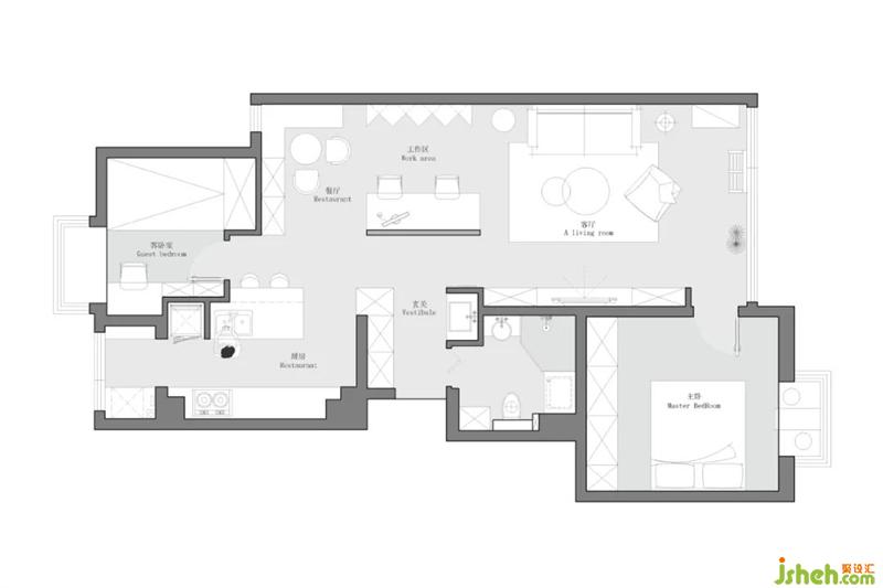 原始戶型的墻體結(jié)構(gòu)并不是都為承重墻,這為設(shè)計(jì)師的改造思路提供了更多的可能性??臻g整體的采光性很好,但是衛(wèi)生間是個(gè)暗衛(wèi),需要引入光線或是采用燈光照明。