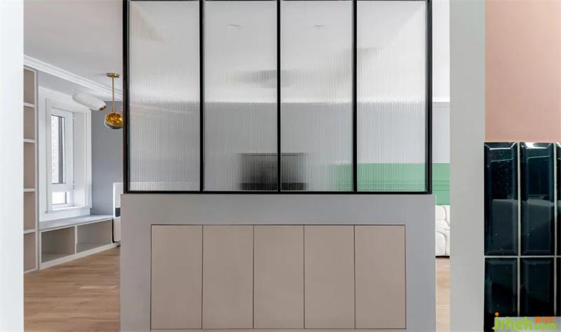 長虹玻璃+內(nèi)嵌柜組合而成的屏風(fēng)隔斷,完美的阻擋了門外的視線,避免一覽無余。長虹玻璃獨(dú)特波浪形紋理,又可以很好的營造一種朦朧的美感。