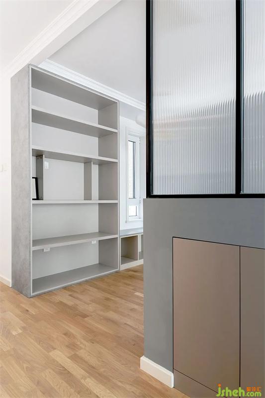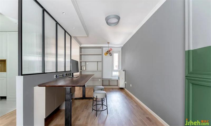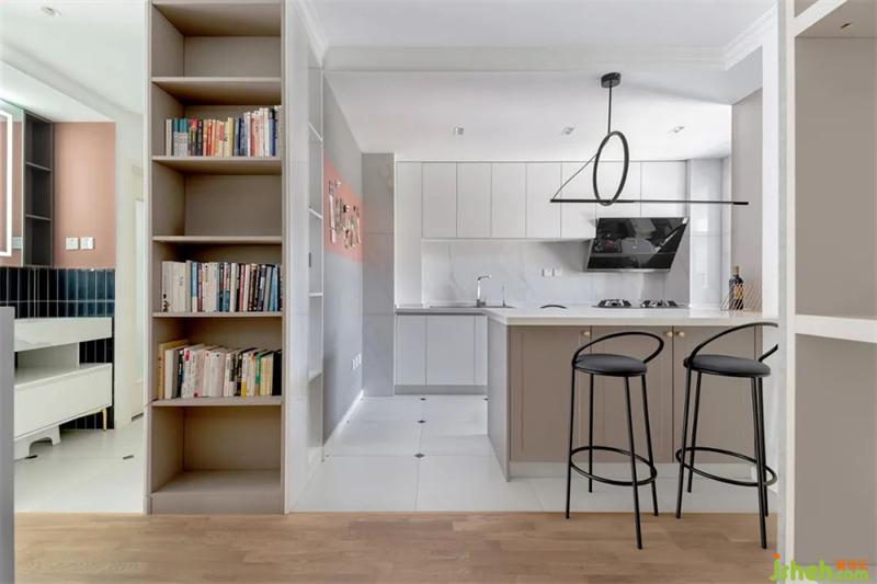 拆除了原本的墻體改造成開放式廚房,用一張寬度970mm獨(dú)立島臺(tái)過度。較高的吧椅可以有效提升入座的舒適度。側(cè)面是一組整高書柜迎接動(dòng)線,讓整體過度更自然。