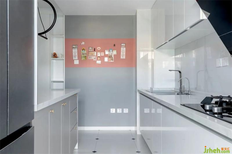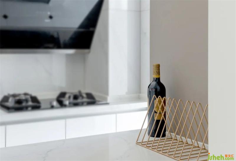 按壓式的柜門無把手,避免磕碰使用起來也更流暢。白色石材的臺(tái)面與墻面,搭配白色櫥柜,明亮的色調(diào)讓空間看起來更加寬敞潔凈。