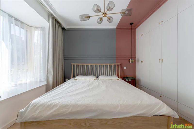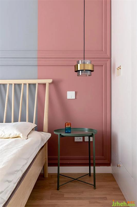 臥室采用了三種墻漆進(jìn)行裝飾,頂部是白色+臟粉色,床頭背景墻則是灰色+臟粉色塊。用不同的顏色“撞”出不一樣的空間藝術(shù)感。