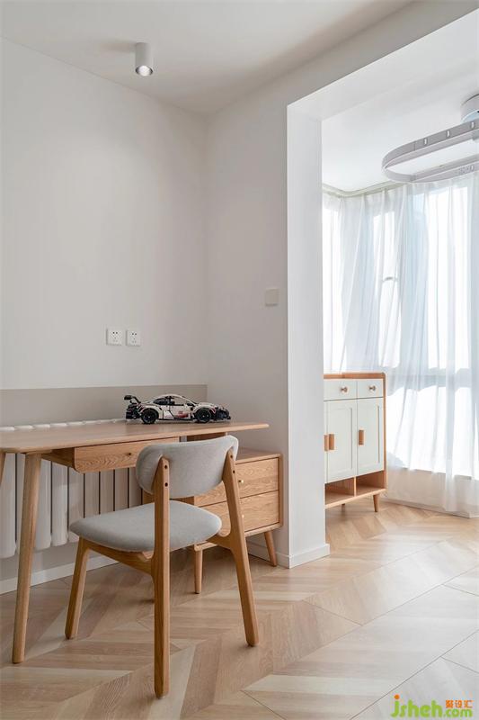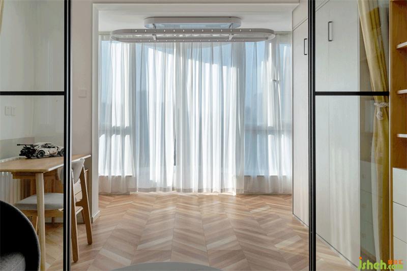 客廳與次臥中間,采用玻璃移門(mén)+窗簾來(lái)進(jìn)行分割,平時(shí)可以做為屋主的工作間使用,也預(yù)備給未來(lái)的寶寶,預(yù)留出了足夠的活動(dòng)空間。