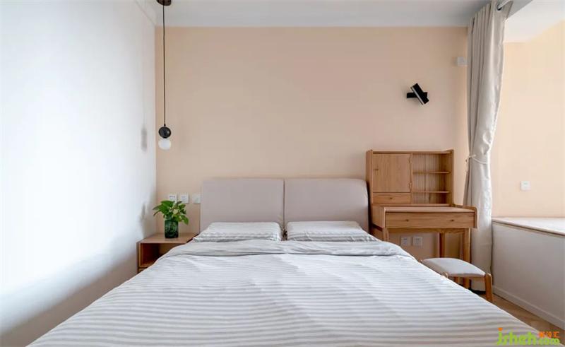 在地臺(tái)與床體之間,安排了絕對(duì)不可舍棄的梳妝臺(tái)。簡(jiǎn)約的壁燈,既可以滿足美妝照明需求,還能充當(dāng)夜讀燈使用。素色的床品與肉粉色的墻面,相輔相成,整體干凈明了。