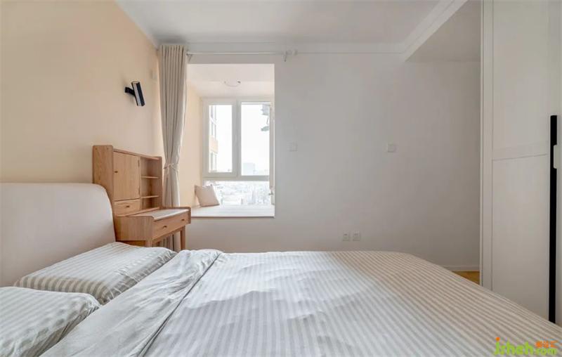 魚(yú)骨拼地板通鋪到次臥,增加地面的延伸感。陽(yáng)臺(tái)的紗簾既隔絕了外部空間,又能夠讓自然光線不動(dòng)聲色的融入廳內(nèi)。