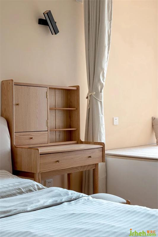 床頭一角,梳妝臺(tái)是女生屋主精挑細(xì)選的,隔板可以用來(lái)擺放她的化妝用品。旁邊的柜門(mén)內(nèi)暗藏一張梳妝鏡,絕對(duì)避免鏡子沖門(mén)的問(wèn)題。