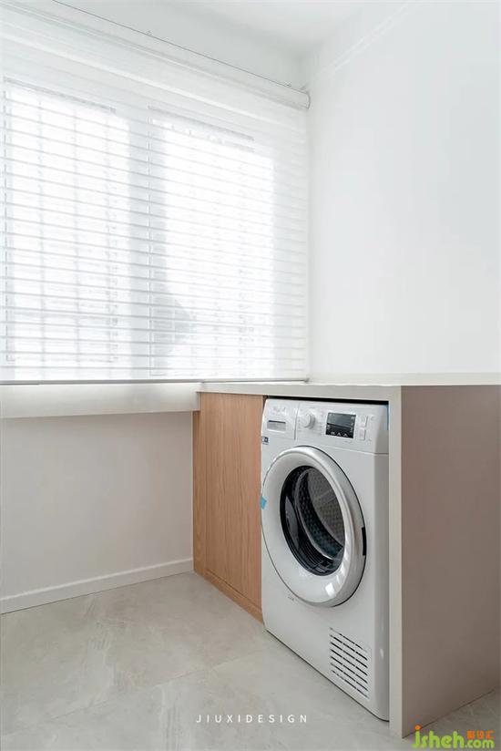 在南陽臺(tái)增加了內(nèi)嵌式烘干機(jī),旁邊還有一組收納柜,上面可作為臺(tái)面用來熨燙,疊放衣服,增加了操作空間。