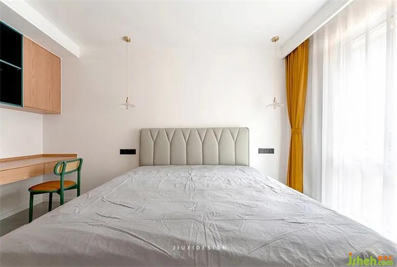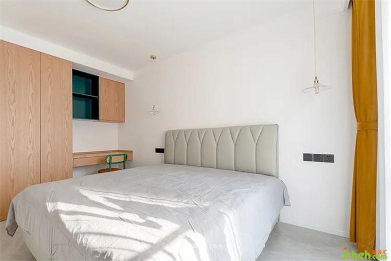 主臥空間依舊延續(xù)客廳風(fēng)格,白+原木色搭配裝修焦糖色的窗簾,成為了整個(gè)空間的主角。