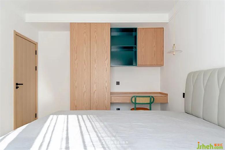 床一側(cè)增加了衣柜裝修和梳妝臺(tái),方便換衣和梳妝。