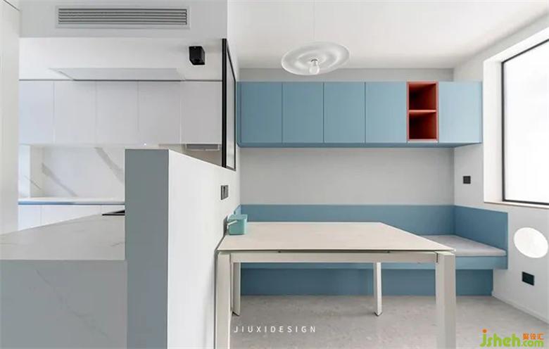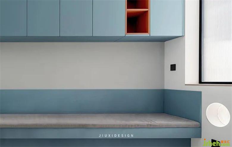 藍(lán)色定制家具搭配白色墻面,給人一種干凈清爽的感覺(jué)。藍(lán)白相間的色彩搭配,也賦予空間一種浪漫裝修設(shè)計(jì)的感動(dòng)。