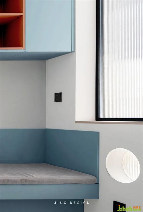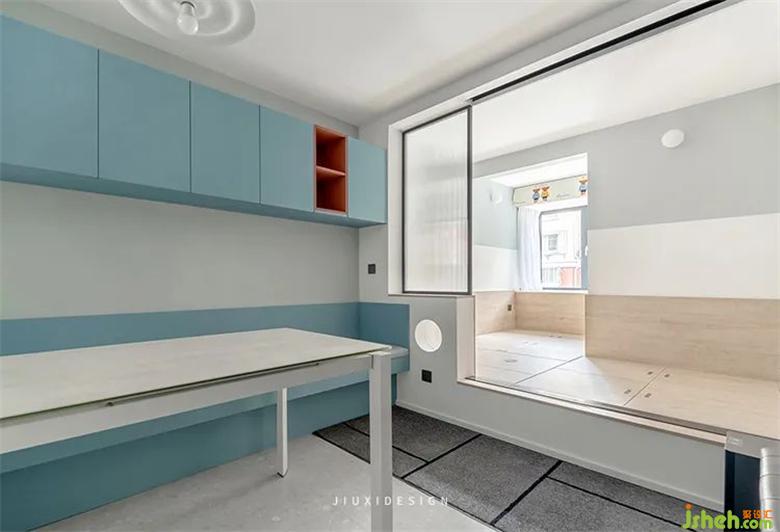 2.兒童房采用地臺(tái)的形式,滿足業(yè)主的儲(chǔ)物需求量。長(zhǎng)虹玻璃移門作為裝修設(shè)計(jì)隔斷,保證了空間良好的采光性。