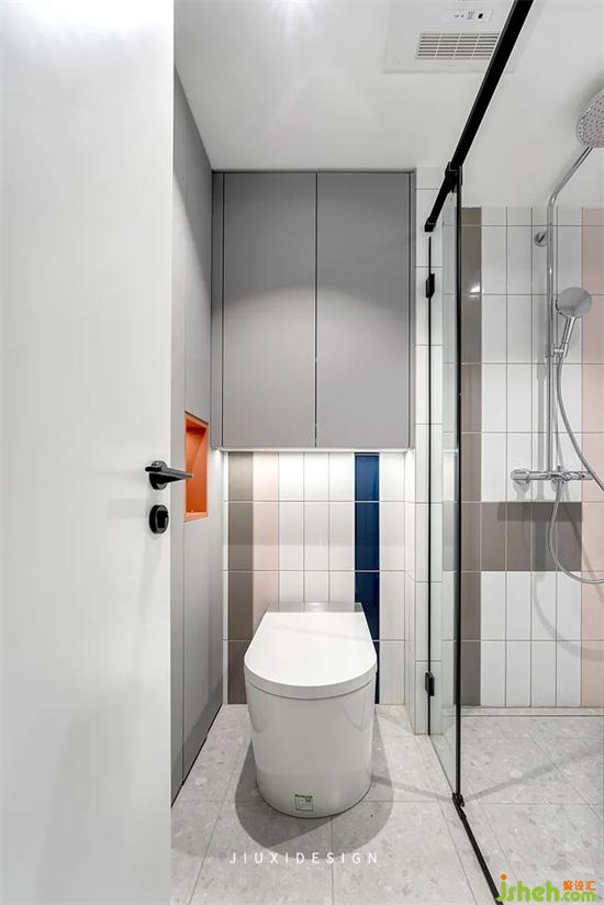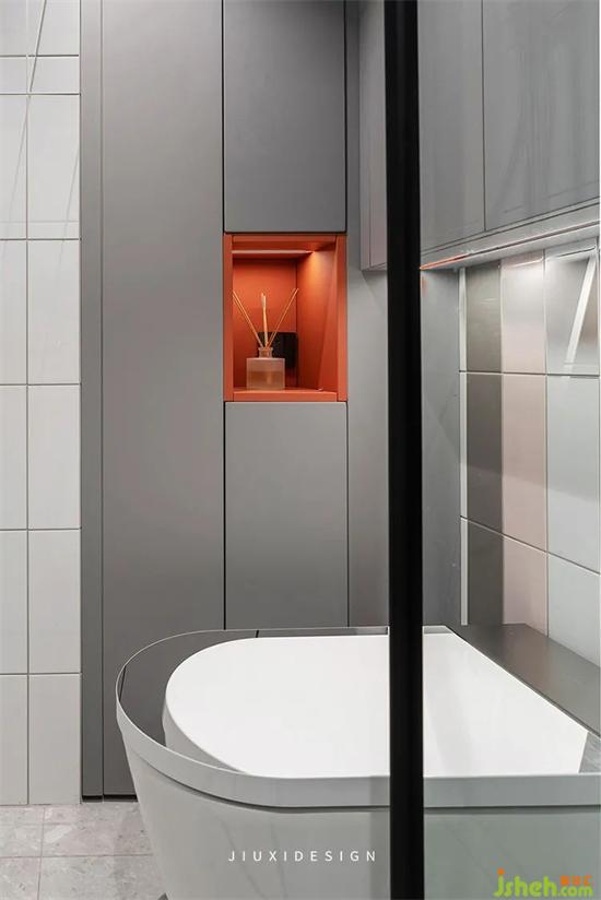 灰色浴室雜物柜用于存放備用的洗浴用品,橙色開放格不僅可以增加對(duì)比提升裝飾性。還可以擺放香薰和小盆栽,改善空氣質(zhì)量。