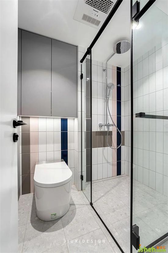 隱藏式水箱頂部?jī)?nèi)嵌收納吊柜,充分利用每一寸空間。黑色窄框玻璃隔斷打裝修設(shè)計(jì)造的一字型淋浴房,避免空間顯得壓抑。