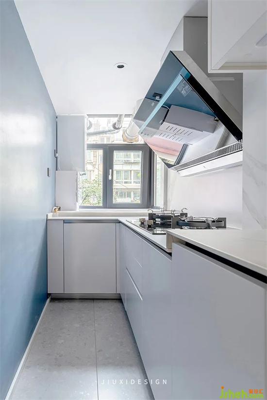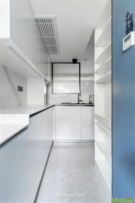 廚房以白色為主色調(diào),更顯干凈整潔。與客廳之間用長(zhǎng)虹玻璃進(jìn)行劃分,同時(shí)避免采光受到影響。裝修設(shè)計(jì)階梯式操作臺(tái),貼合動(dòng)線和習(xí)慣讓切菜不累腰。右邊的隔板柜,可以存放調(diào)料鍋蓋的用品。