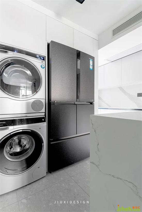 洗衣機(jī)+烘干機(jī)+雙開門冰箱,與家政柜相裝修設(shè)計(jì)結(jié)合,整體更顯統(tǒng)一。同時(shí)還能留出800mm的過道空間,合理的利用空間提升動(dòng)線的流暢性。