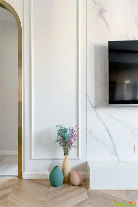 金色的門套搭配石膏線,配上爵士白石材,簡單的輕奢風(fēng)也不會顯得太過復(fù)雜。重點要說的是這個拱形門洞,完成這樣的窄門套,對木工工藝要求度要高,需要達到完成面都是齊平的標準。