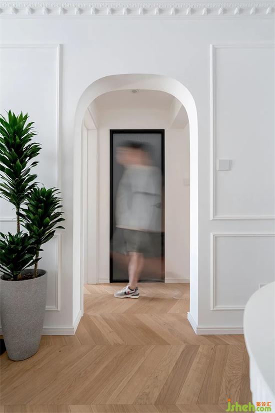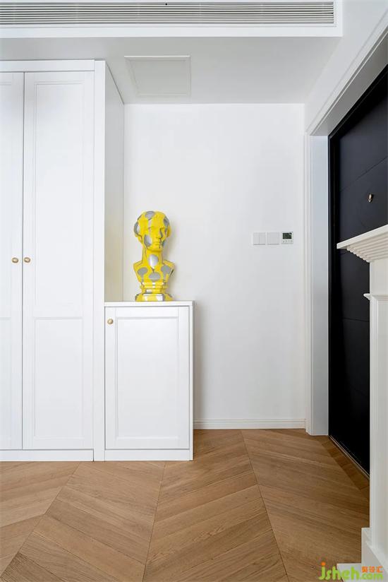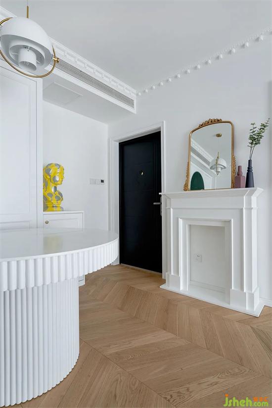優(yōu)化后的玄關(guān)增加了大量儲物空間,純白色的壁爐+銅鏡,營造法式獨(dú)有的裝修浪漫氛圍。