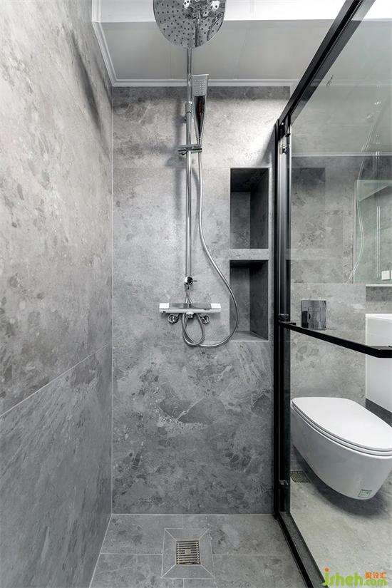 衛(wèi)生間增加了淋浴房,選用了好清理衛(wèi)生的壁掛馬桶。裝修通鋪深灰色的磁磚,空間既整體又耐臟。